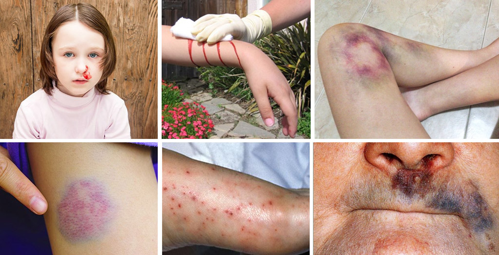 Признаки | • Длительные кровотечения из мелких порезов • Кровотечения из носа • Синяки (гематомы) без видимой причины • Кровоточивость десен • Длительные менструации у женщин • Кровь в моче или кале • Внутренние кровотечения (могут быть без видимых симптомов) |