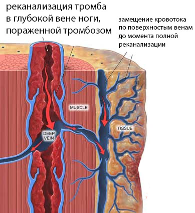 Со временем, по мере замещения тромботических масс фиброзной тканью, в них образуются узкие щели и каналы, в которые внедряется эндотелий — происходит реканализация сосудов. Каналы внутри тромба начинают напоминать сосуды с соответствующей выстилкой, стенка принимает характеристики артериальной или венозной (в зависимости от места тромбоза), и кровь начинает циркулировать через образовавшиеся полости. Этот процесс, известный как васкуляризация тромба, продолжается несколько недель.